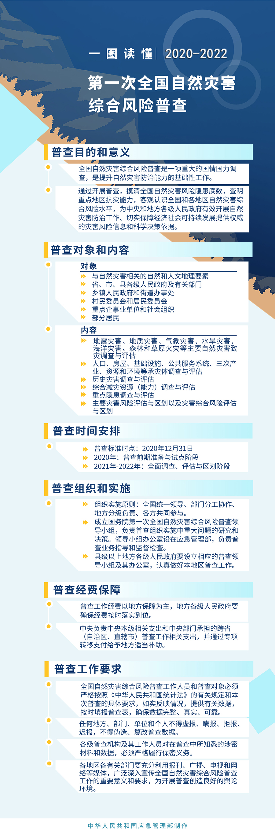 過去一年多來,應(yīng)急管理部會(huì)同多個(gè)部門和單位,組建了全國自然災(zāi)害綜合風(fēng)險(xiǎn)普查技術(shù)組,凝聚100余位專家的力量,論證編制普查相關(guān)方案。普查方案明確了三個(gè)基本目標(biāo),分別是:摸清全國自然災(zāi)害風(fēng)險(xiǎn)隱患底數(shù),查明重點(diǎn)區(qū)域抗災(zāi)能力,客觀認(rèn)識(shí)全國和各地區(qū)自然災(zāi)害綜合風(fēng)險(xiǎn)水平。