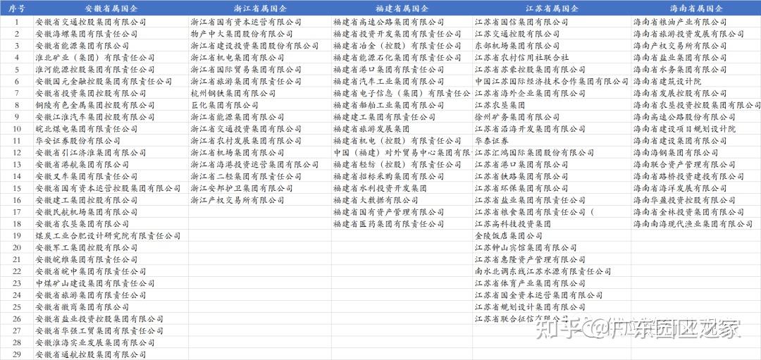 東南一徽包浙江、福建、江蘇、海南、安徽等5省,共107家省屬國(guó)企,其中安徽省29家、江蘇省26家、浙江16家、福建18家、海南18家。